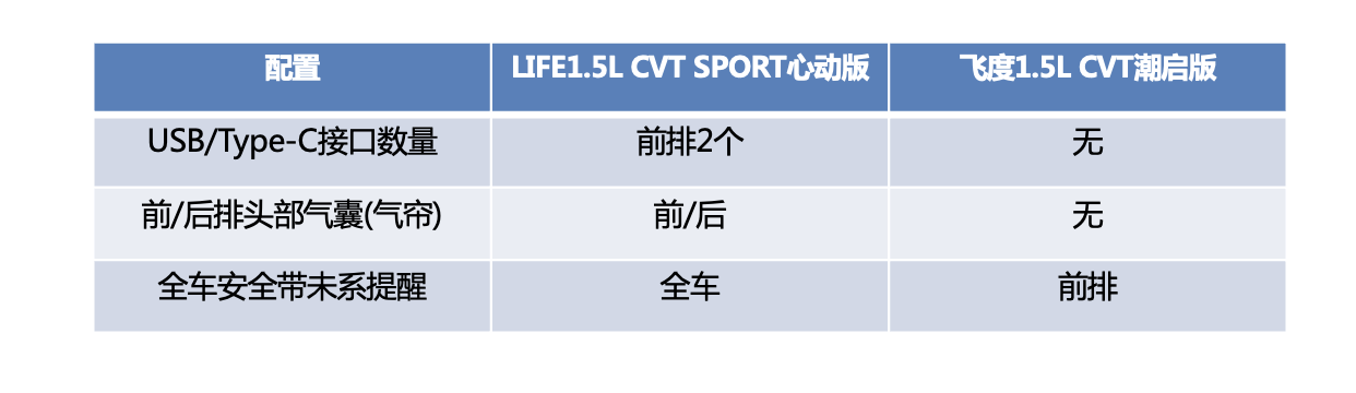 在配置方面,将LIFE与飞度的标准配置放在一起比较,我们发现LIFE标配了USB接口、六安全气囊、全车安全带未系提醒等丰富配置,无疑能够为消费者日常用车提供能加便利、安全的用车体验,而上述配置在飞度上均不是标配,只有购买价格更加昂贵的高配车型,才能获得这些原本在LIFE就是标配的配置。