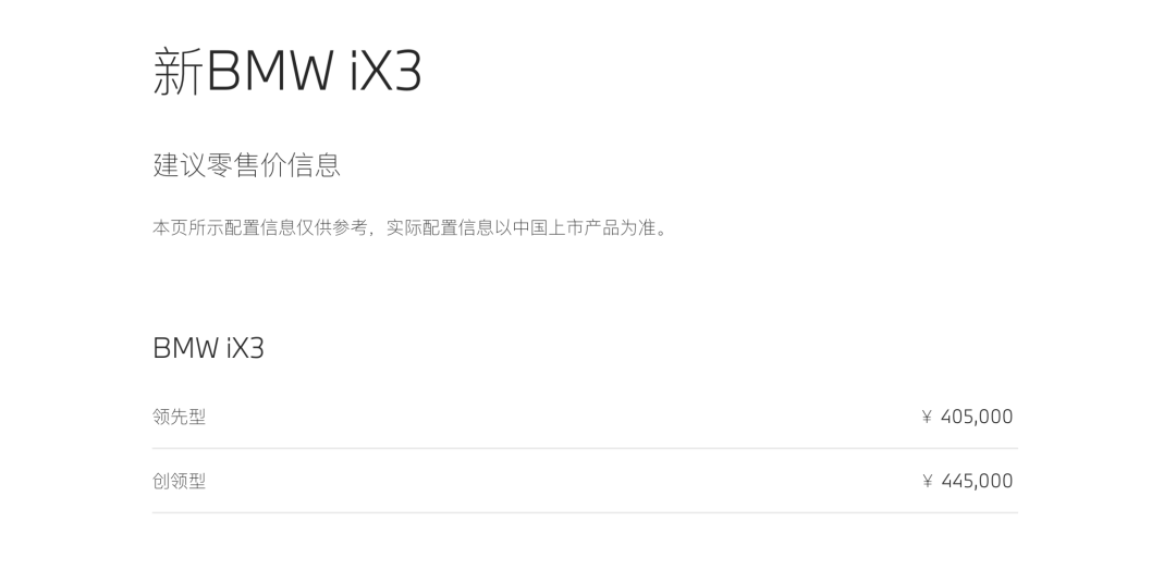 iX3于2020年9月正式上市,推出指导价为40.5万的iX3领先型以及44.5万的iX3创领型。