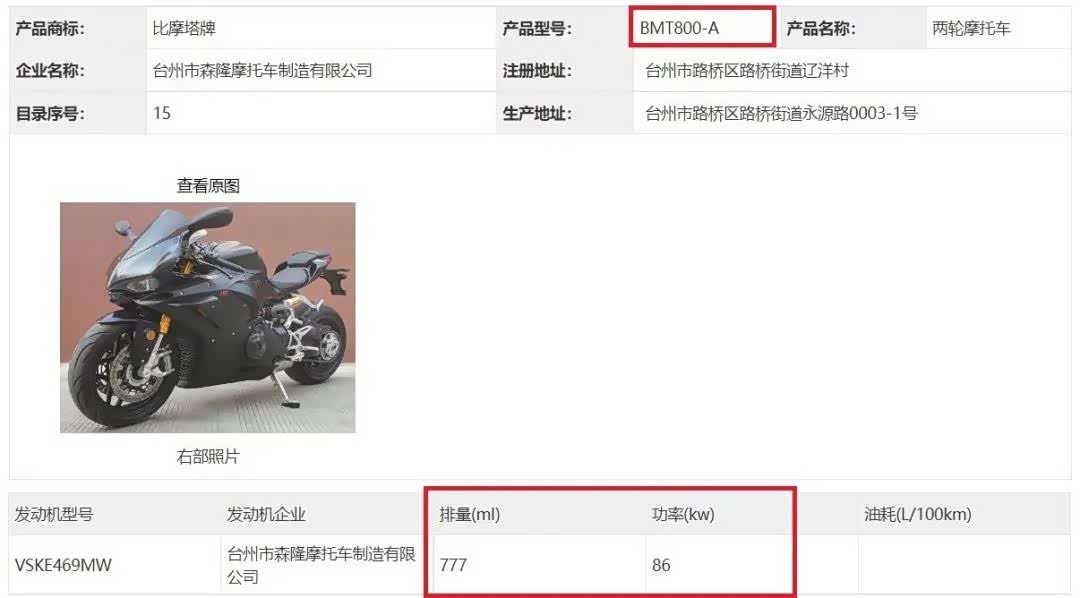 工信部新车公告显示,浙江森隆申报了一款800cc级别的仿赛车型,而这一次没有用摩枭的品牌,而是用的比摩塔。是的你没听错就是那个意大利的比摩塔,显然这个汉字商标被森隆给注册了。而之前的摩枭也是森隆旗下的,所以这款车称之为摩枭800RR也没什么问题。
