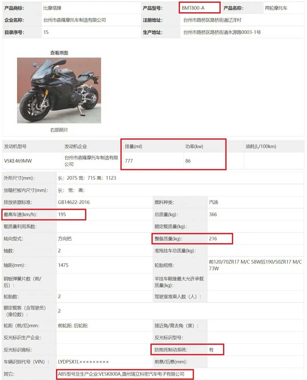 从申报信息看,摩枭800RR搭载的是维森克的直列四缸发动机,最大功率86kw(117匹),最大扭矩应该是93Nm左右,因为这台发动机嘉爵也在用,详细的发动机数据已经公开了。该车的申报极速为195km/h,整备重量216kg,配备有ABS防抱死系统。