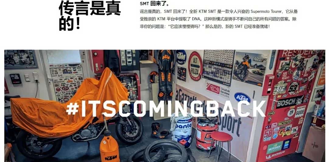 其实,KTM曾经在2009年,就推出过类似的KTM 990 Supermoto Touring车型,可惜当年990 SMT并没有存在太长时间,在2013年就匆匆退出市场了。随着新的890系列车型局面打开,KTM的SMT之梦再度苏醒。而KTM官方主页的消息也明显给出了it's coming back (它又回来了)的字样。接下来就看KTM什么时候发布这款车了。