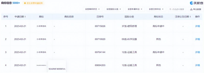 小米汽车申请注册多美商标,包括但不仅限于“小米摩德纳”和“MODENAT”,类目是运输工具和科学仪器等,商标目前还在申请中。