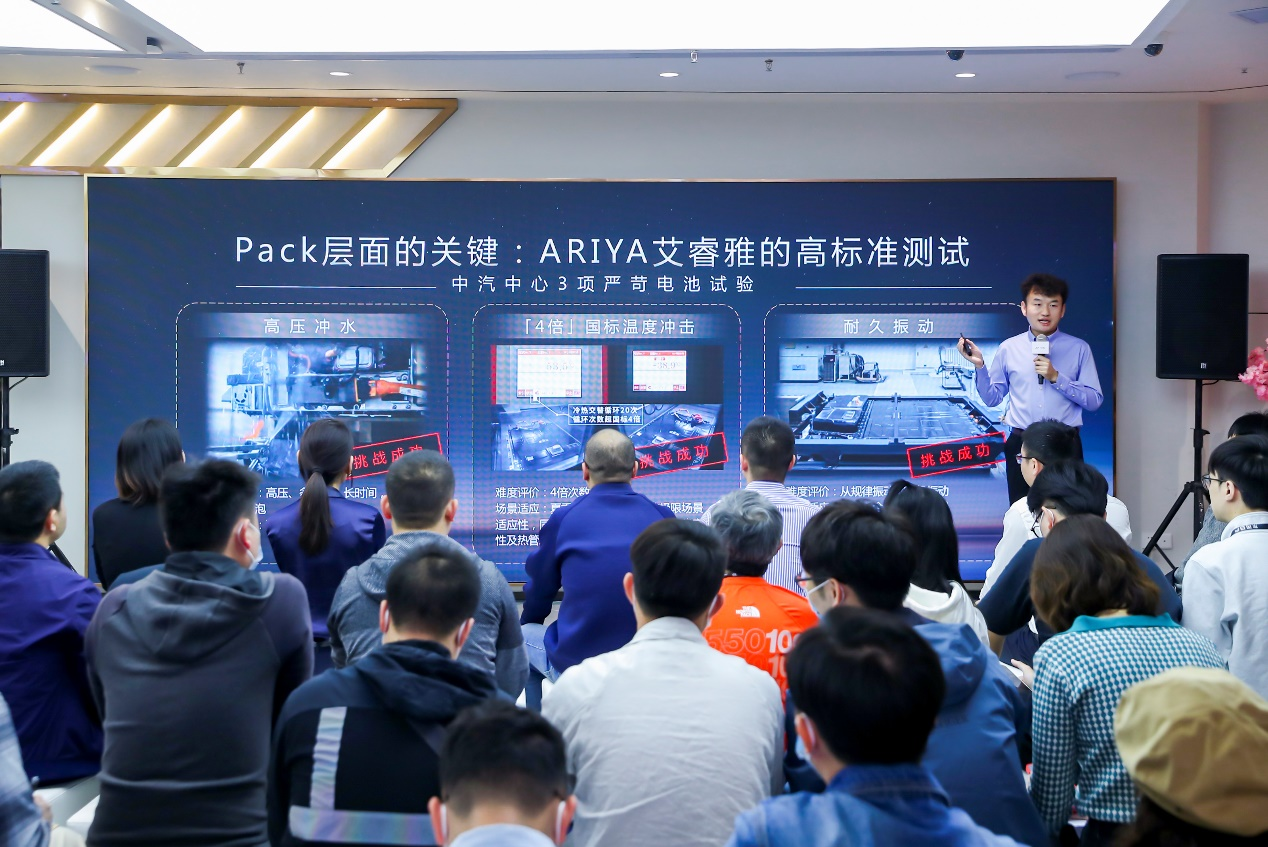 不久前,ARIYA艾睿雅通过了中国汽车技术研究中心有限公司(以下简称“中汽中心”)“高压冲水、4倍国标温度冲击、耐久振动”三大严苛考验,以“无水渗漏入电池包内、电池包功能正常、内外部无结构性损伤、气密性保持完好、螺栓扭矩无明显衰减”的优异成绩,顺利通过中汽中心的电池安全挑战。