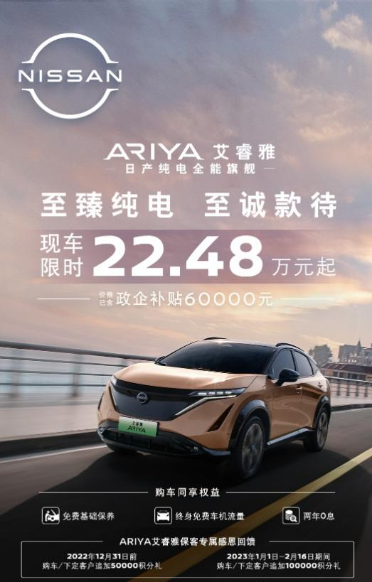 截止至3月31日,新购车用户可享限时购车优惠,ARIYA艾睿雅长续航版仅需22.48万元、长续航顶配版23.78万元、高性能四驱版26.78万元、高性能四驱顶配版28.28万元,更有免费基础保养、终身免费车机流量及两年0息重磅同享福利。同时,针对已购ARIYA艾睿雅的老用户,东风日产特意推出保客专属感恩回馈,以5000-10000元等值ARIYA Life积分尊享福利,拉满用户的期待感,让ARIYA艾睿雅的款待之道,切实惠及每一位车主。