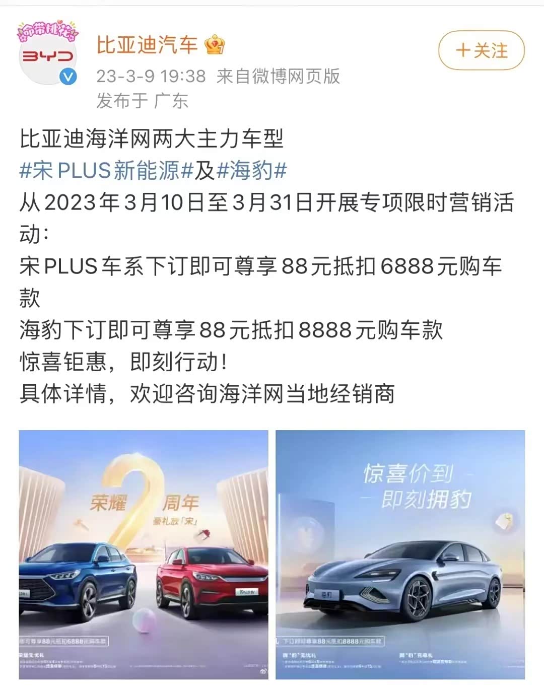 新能源行业巨头比亚迪也针对旗下产品推出了优惠政策,3月10日至3月31日下订宋PLUS车系和宋Pro DM-i均可享88元抵扣6888元购车款,下订海豹可享88元抵扣8888元购车款。