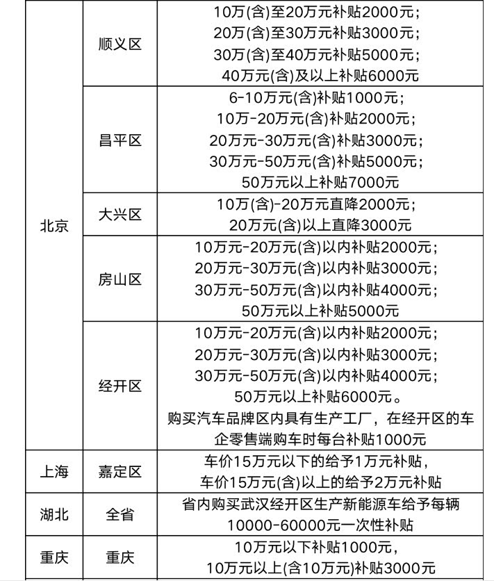 值得一提的是,除湖北省联合车企推出补贴外,北京、天津、上海、浙江、河南、四川、黑龙江、山西、云南、海南和贵州等数十个省市也相继出台促进汽车消费政策。其中,天津发放汽车消费补贴6000万元,山东发放2亿元汽车消费券。