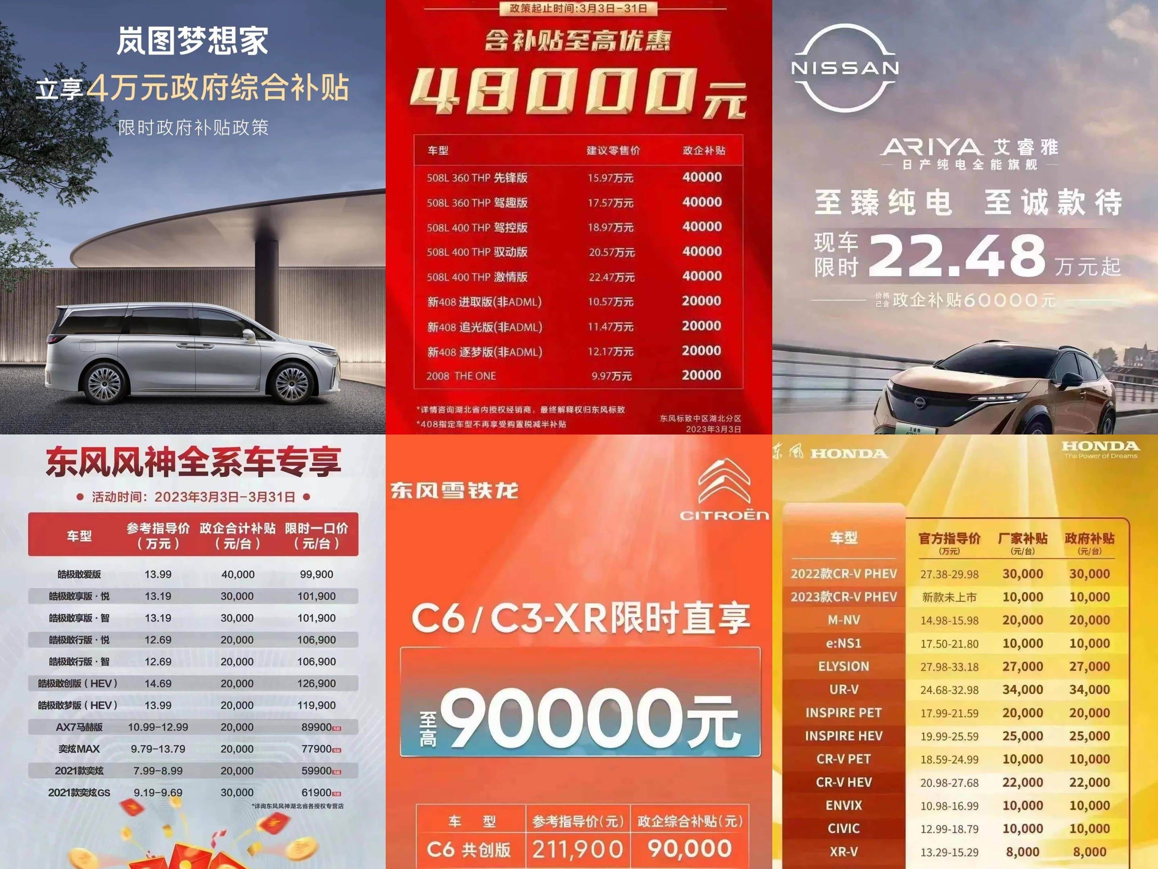 3月6日,一篇名为《最高补贴9万元,湖北出台最强政企购车补贴政策》的报道在网络流传,并引起强烈反响。在促进大宗商品消费的主旋律里,湖北省率先开启购车补贴,东风汽车旗下东风本田、东风日产、东风雪铁龙、东风标致、东风风神、岚图、东风富康7大品牌的56款车型参与购车补贴。