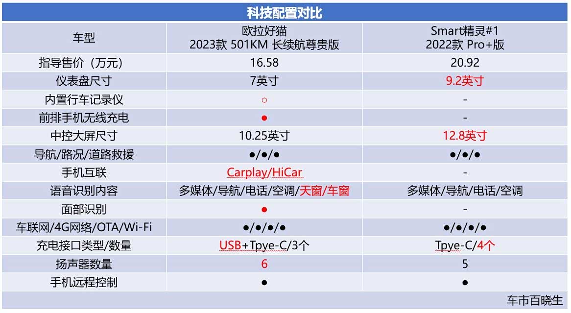 最后是两台车的科技配置对比,由于smart精灵#1最高配接近了30万元,因此它的全液晶仪表和中控大屏尺寸都相比欧拉好猫更大,不过在功能上两台车都提供了车联网、手机远程控制、导航以及智能语音交互系统,不过欧拉好猫所提供的面部识别、手机Carplay等功能依然是smart精灵#1全系所不配备的。