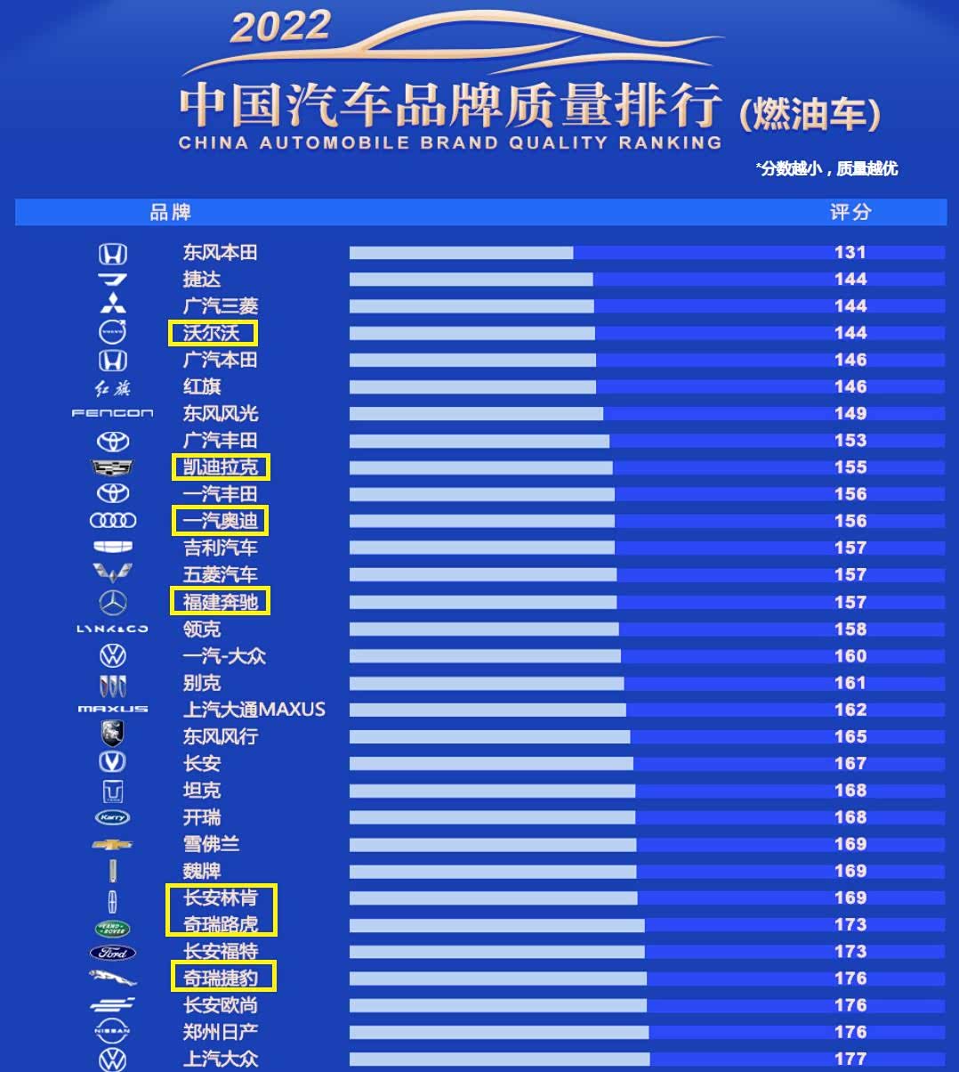 而质量分处于行业平均值之上的豪华车品牌还有:福建奔驰、长安林肯、奇瑞路虎和奇瑞捷豹,福建奔驰的表现比较出色,质量分数也不足160,大家对福建奔驰不是很熟悉,它主要是生产MPV车型,比如奔驰V级和奔驰威霆等。长安林肯的质量分只有169,“国产化”之后的林肯汽车,也凭借出色的性价比表现,赢得了很多消费者的青睐,当然它的品控也是非常令人放心。奇瑞路虎和奇瑞捷豹的表现有点出人意料,虽然它们的市场表现不是很理想,但它们的质量分也都低于行业平均值。