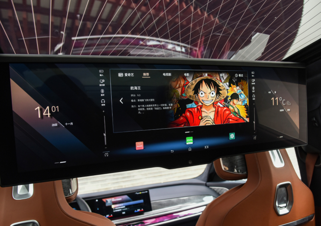 这个漫哥也不懂怎么称呼了,反正就是中控台之外的屏幕,姑且就算它多胶余吧。比如说后排座椅屏幕,以前高端车让后排乘客有贵宾级享受的;不过现在出租车上都能看到了。既然座椅靠背屏幕已经变得廉价,那就升级一下吧。比如宝马7系,后排棚顶塞了一块31英寸的“彩电”;对比起来,理想L9后排15.7英寸屏就显得寒碜了,像极了长途大巴车上的挂顶屏幕。