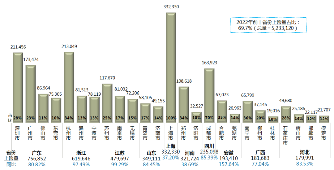 在2022年上险量TOP10省份中,除广东省外,排名第二的浙江省仅杭州市就占了34%,再加上温州市和宁波市,三市合计占比高达60%;
