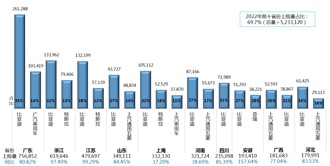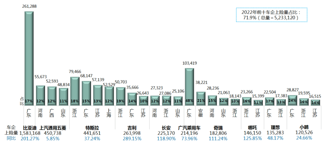 图表3:2022年新能源乘用车上险量TOP10省份及主力车企(本省占比≥10%)