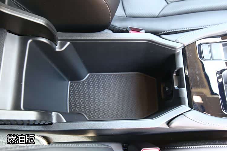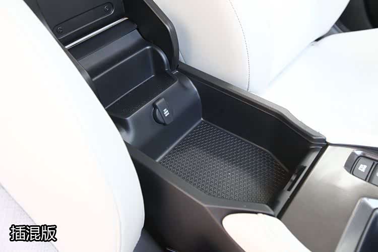 末段是中央扶手及中央储物盒,内置12伏电源,混动版的储物盒比较浅,放不了多少东西,1.5T燃油版比较深,容积更大一些。