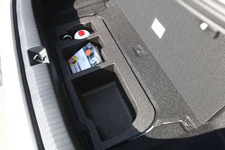 行李厢地板下面,有两种布局。插混版是个储物槽,内置充电线、补胎剂、气泵、拖车钩,这些东西刚好全部容纳,无富裕空间。