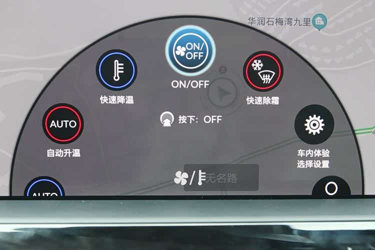 转动旋钮,中控屏随即出现一个半圆形图标——可以在数个选项中,选择所需要的内容,比如,快速除霜、快速降温、自动升温,等等,此外还有自定义,一键切换包括空调、音响、灯光等在内的数个功能。