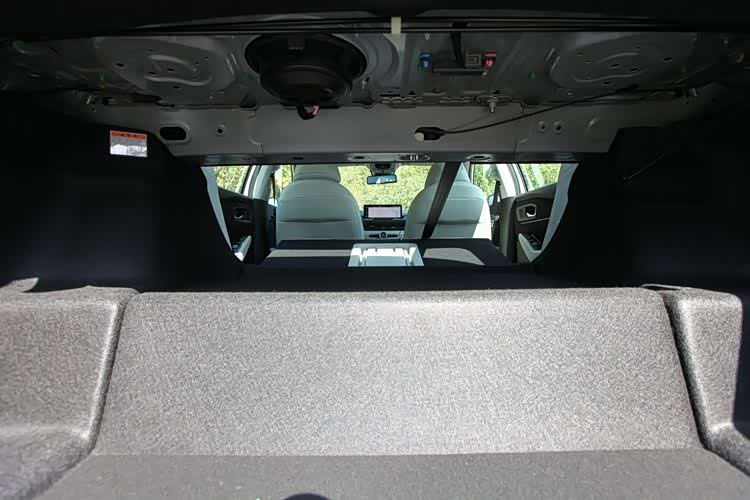 由于动力电池和油箱的缘故,插混版的行李厢被占用了一部分,因而形成阶梯状——有个高度约为200毫米左右的台阶。上半段宽度约960毫米,高度约300毫米;下半段宽度约1375毫米,进深约360毫米,即使大尺寸的旅行箱,比如32英寸的,也能横卧着放进去,如果是20英寸的登机箱,可以两两平铺,能放进去大概七八个。