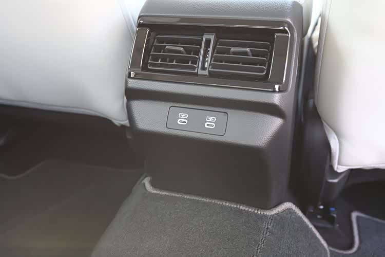 后排座地板中间位置,有个高约150毫米左右的凸起,第5人面前的最短间距大概是270毫米,前面安置着空调出风口与双Type-C接口。