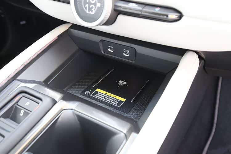 中间平台分成3个部分,前段是电源区,面壁上有2个Type-C接口,电流3.0安培,其下是手机无线充电的位置,最大15瓦。