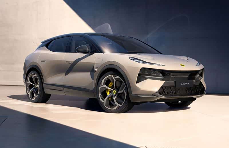 路特斯很擅长空气动力学和轻量化的技术打造,在这款新车上我们也能看到很多。凶狠的前脸,有2道贯穿式气道组合,加上侧翼子板气道,能够巧妙梳理高速中的气流。全系标配主动进气中网,开启后帮助车辆散热,关闭后能增加15公里续航和22.5kg下压力,能很好的提升性能。