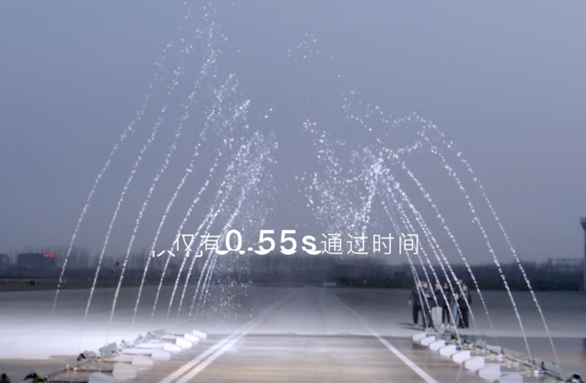 而得益于岚图追光电池峰值放电功率可到500kW,所以其最高时速可达210km/h,完全可以做到在水滴落下之前,通过长27m的喷泉跑道。