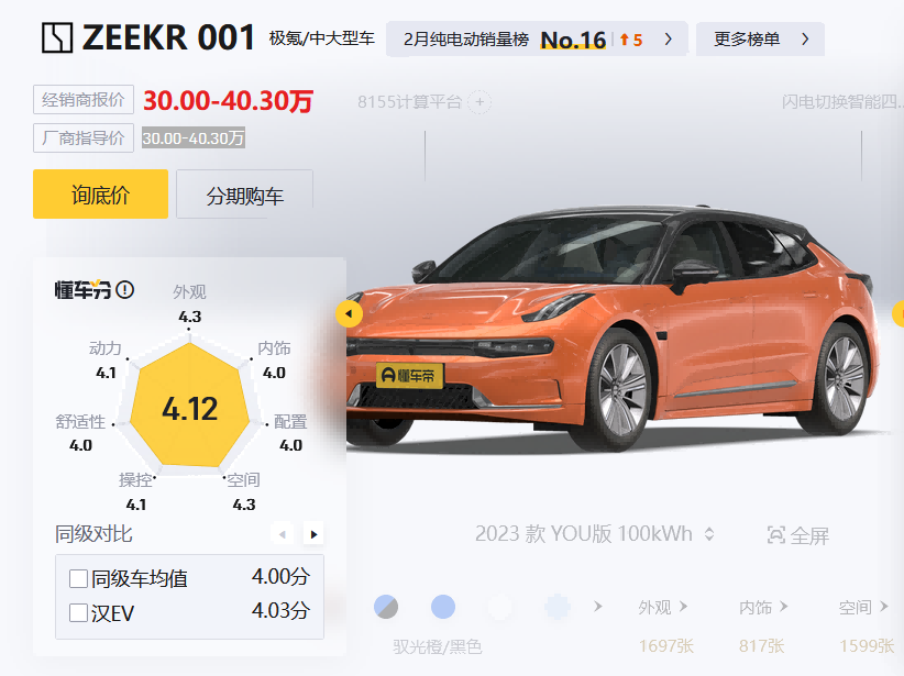 笔者翻阅了了汽车网站上关于各维度的评分,试图找到ZEEKR 001的销量密码,最后发现其外观设计功不可没。