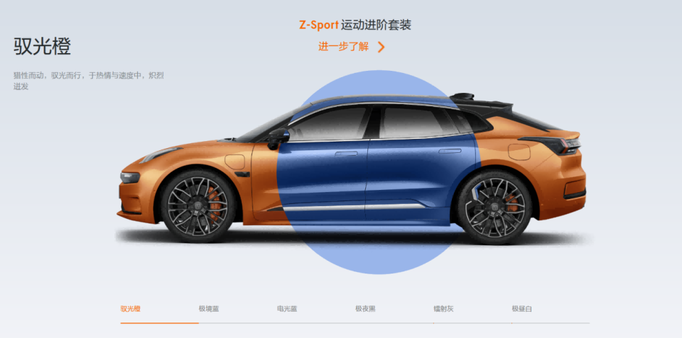 2023款ZEEKR 001共有6种外观配色,分别为极昼白、镭射灰、极夜黑、电光蓝、极境蓝、驭光橙,其中驭光橙、极境蓝、极夜黑为新增的三种颜色。