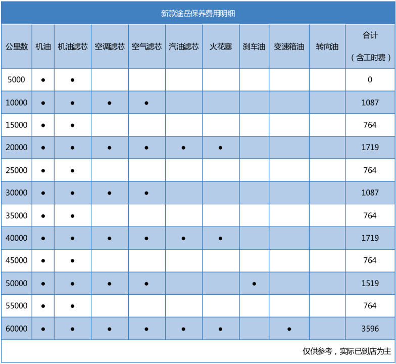 在保养费用方面,我们抛开厂家和经销商给出的一些保养优惠政策不谈。根据大众的保养手册显示,新款途岳的首保时间为5000公里,其首保免费,之后的保养间隔为同样为5000公里。那么,如果大致按照6年总行驶60000万公里的情况下,新款途岳总保养费用是13859元,以每年1万公里的驾驶里程计算,平均每一年成本约为2309元。