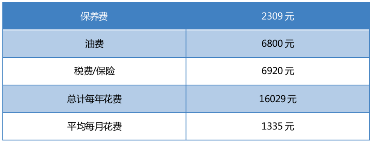 其次,保险缴纳车损险与第三者责任险100万再加不计免赔的计算方式,以及加上未出险情况下,保费第二年8折,第三年7折,取三年保费的平均值,这些条件一并来计算新款每年的用车成本总计为16029元,平均每月花费为1335元。具体如以下表格: