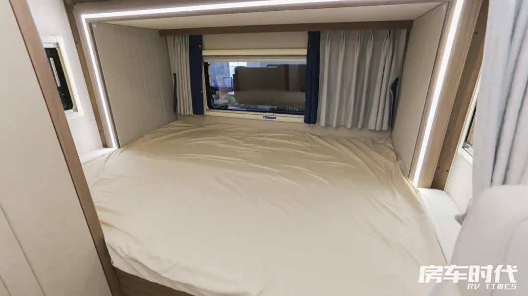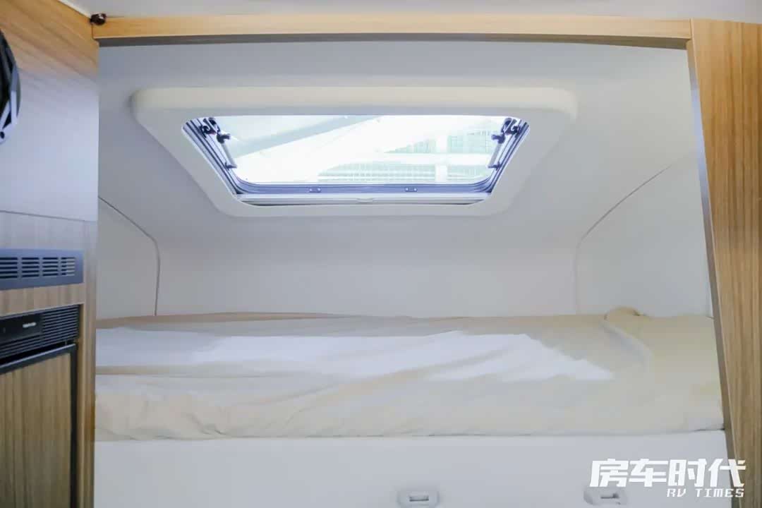 固定的睡卧区设计在车尾,整个床铺位于尾部的拓展结构上,向外拓展后形成一张更大的床铺,配置有乳胶复合床垫,柔软舒适。床铺的顶部为储物吊柜的设计,车内储物功能丰富。