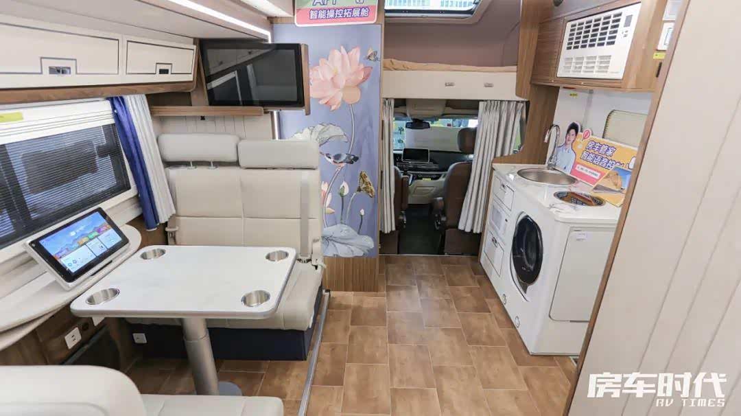 生活区典雅精致,从前到后的布局依次为驾驶室+额头床、会客区、厨房区、卫浴间、尾置横床。会客区为经典的双人对坐+电动升降式餐桌的布局,乘客区座椅配备有三点式安全带以及ISOFIX儿童座椅安装接口,顶部配置有客厅MAX电动换气扇。前排座椅的上方设置有一台22寸网络电视,生活舱配有4个JBL扬声器,丰富旅居生活。