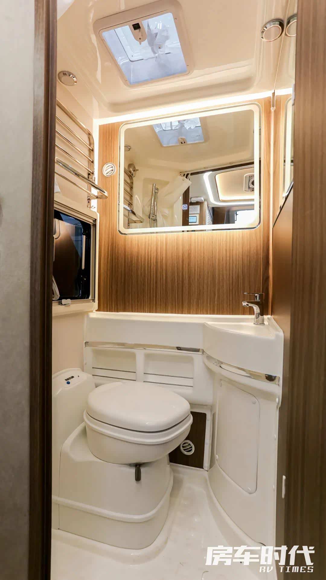 独立卫浴间设计在中门一侧,内部空间可观,触控式灯具开关设计在外侧,方便开关操作。卫浴间内部配备有旋转马桶、触控式美妆镜、毛巾架、一体式洗水池、置物格、淋浴花洒等。