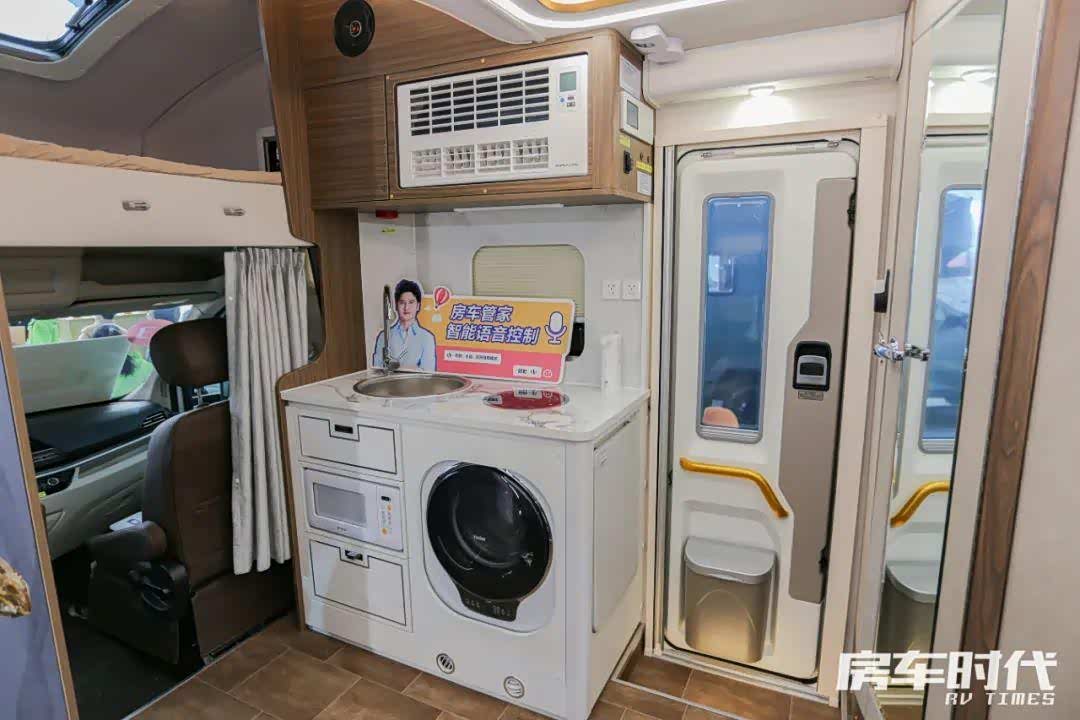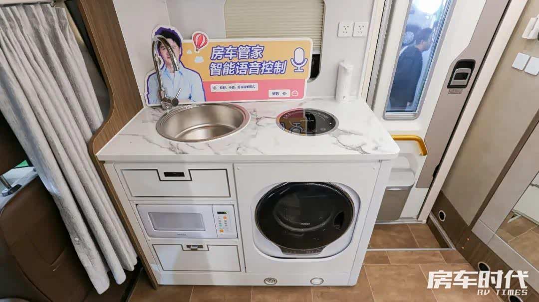 进门一侧为厨房区,台面上配备有圆形水池、电磁炉,台面下方内嵌有一台微波炉以及一台洗衣机,实拍车辆配置有户外厨房包,包含有外置柴油炉、220V插座、外置淋浴器、电动吸水口、电动排水阀,配备有即热式饮水机,带有更加优质的旅居生活体验。