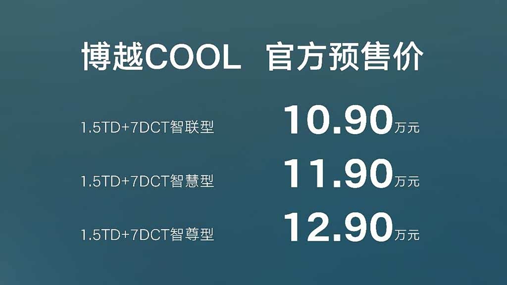 4月7日,吉利全新紧凑型SUV车型博越COOL预售开启,新车推出了3款车型,预售价区间为10.9万-12.9万元。新车动力搭载1.5TD四缸发动机+7DCT湿式双离合变速箱,发动机满足国六b排放标准。博越COOL预计4月底正式上市。