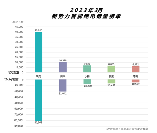 甭管比亚迪和特斯拉是靠怎样的民间力量成长为行业翘楚,埃安和理想又是因怎样的差异化产品优势,在一季度售出新车80,308辆和共交付新车52,584辆,从蔚来、小鹏、零跑到极氪、问界、岚图,出身不同却难逃同一种命运。