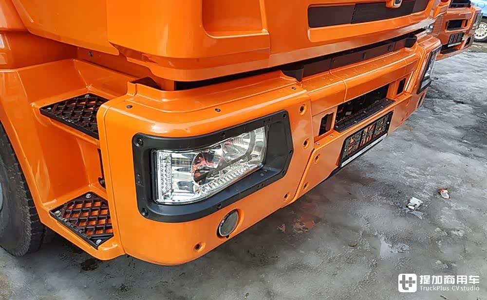 实拍的KAMAZ-6520卡车是2023年崭新出厂的车型,与此前车型的区别在于,KAMAZ-6520采用了全新设计的三段式保险杠,它采用全钢材料制成,坚固度方面升级很大。此外,三段式设计让其能够分段拆卸,便于后期维修。在此基础上,车辆换上了新的大灯,并且在大灯下方增添了雾灯,增强照明效果。