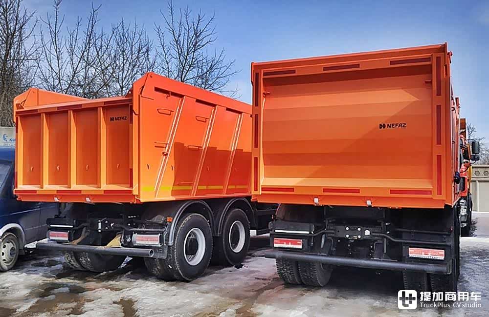 KAMAZ-6520的上装也进行了改进。它的尾门高度更高,变相增加了货箱内部的装载空间。左侧为老版NEFAZ上装,可以看出它们二者之间的显著区别。