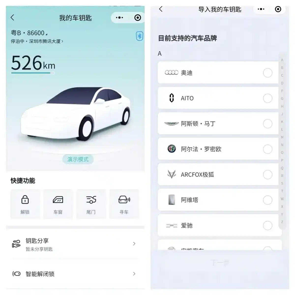 通过与主机厂的官方应用进行打通,用户就可以通过小程序体验到数字钥匙功能,包括解锁车辆和简单的车辆控制。