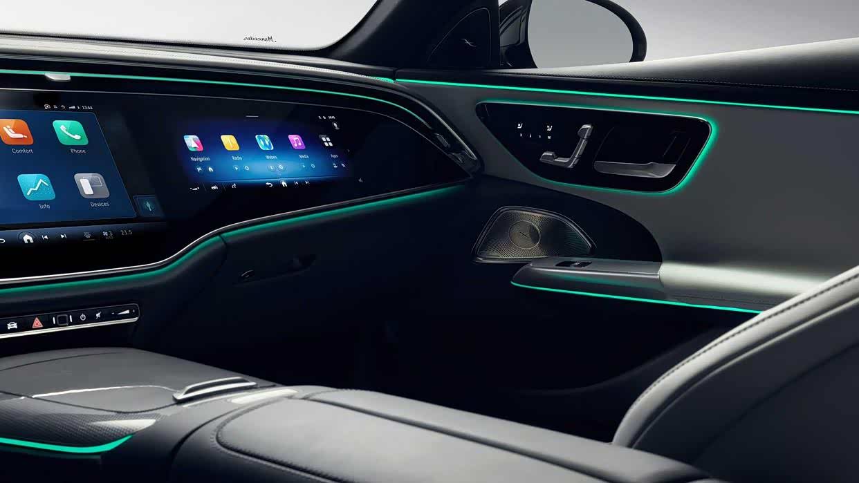 全新E级首次搭载“随音悦动”功能,配合时髦的氛围灯,让音乐节奏也能被看见。Burmester 4D环绕立体声音响系统拥有高达21个扬声器与振荡器随音乐律动,为车内成员带来沉浸式体验。此外,副驾乘客在享受车载娱乐内容的同时,也不用担心驾驶员分心,乘客屏幕自带“隐私模式”即使驾驶员想看也看不见。
