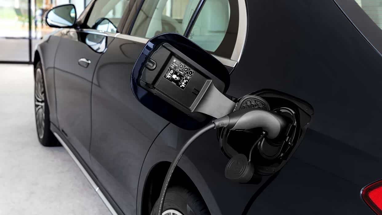车身侧面,与EQ家族的纯电动车型不同,保留了传统三厢轿车的比例造型,并拥有短前悬的经典设计,这样的车身比例在新能源化的今天给人的感觉十分协调耐看,搭配侧面粗壮有力的筋线,还为车身注入了些许动感与年轻活力。