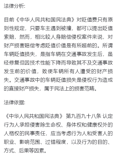 按照目前的法律法规和保险公司的保险条例,关于赔偿事故车辆的贬值损失是由事故责任方赔偿,目前保险公司还没有车辆贬值费这个理赔项目。尽管车子碰撞后造成价值贬损这是客观事实,可目前保险公司不会为这部分费用买单。虽然保险公司承担了车辆的全部维修费用,但是这样的结果并不能改变车辆存在重大贬值损失的事实。所以我们的粉丝主张车辆的贬值损失也是完全可以理解的。《最高人民法院关于审理道路交通事故损害赔偿案件适用法律若干问题的解释》第十四条第二款规定,道路交通安全法第七十六条规定的“财产损失”,是指因机动车发生交通事故侵害被侵权人的财产权益所造成的损失。根据这一规定,再结合本案实际情况,我们客户的车辆发生的该起事故符合贬值的情况,所以也预祝他能成功挽回自己的损失吧。