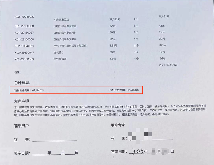 前面说了定损已经完成维修清单也出来了,那么维修费用是明确的,并且受损的部位要切割更换焊接,该车的配件更换+钣金+油漆+工时的总费用为:44372元。同样我需要再次对维修明细进行核对,核对结果无误。这维修费用还是不便宜啊......已经超过了车价的10%了。