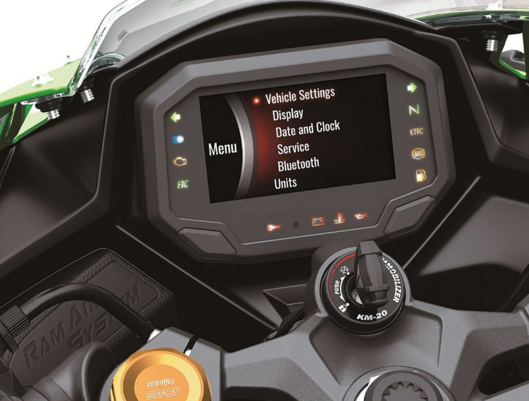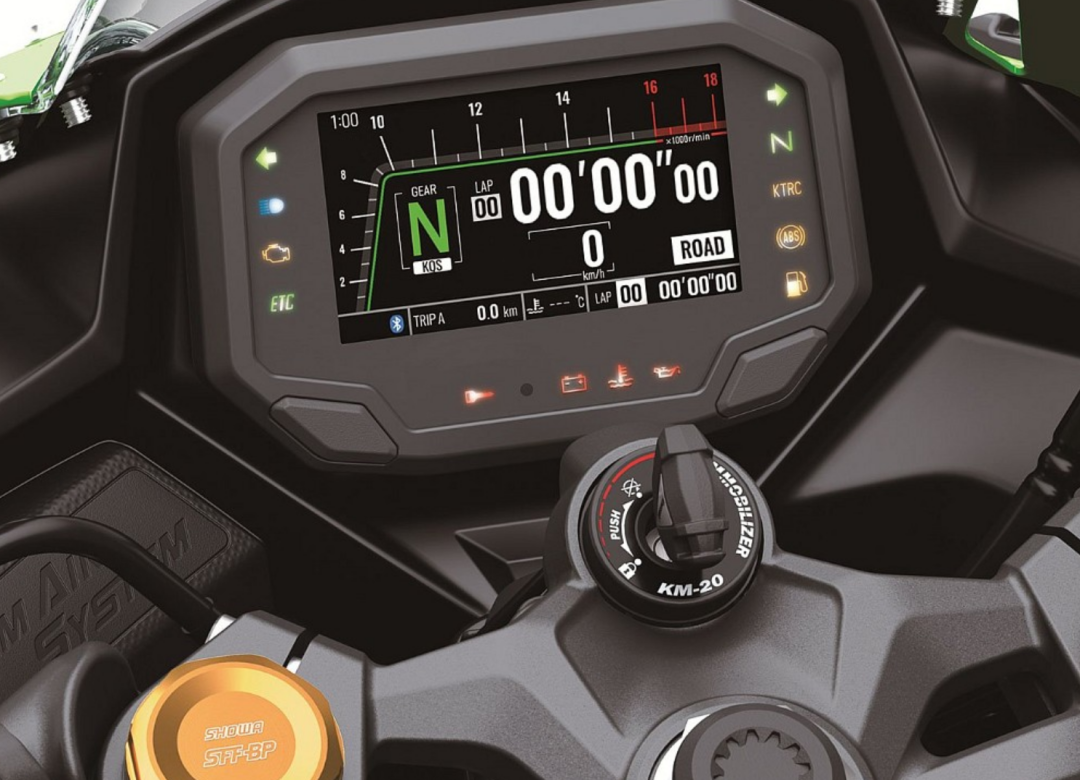 ZX-4R仪表盘配备4.3英寸全数字彩色TFT液晶屏,可视度高。它集成了赛道模式,以易于阅读的方式显示10,000 rpm及以上的单圈时间、档位和RPM。Kawasaki RIDEOLOGY应用程序可用于连接到智能手机以实现多种功能,包括记录GPS路线信息和车辆行驶信息。
