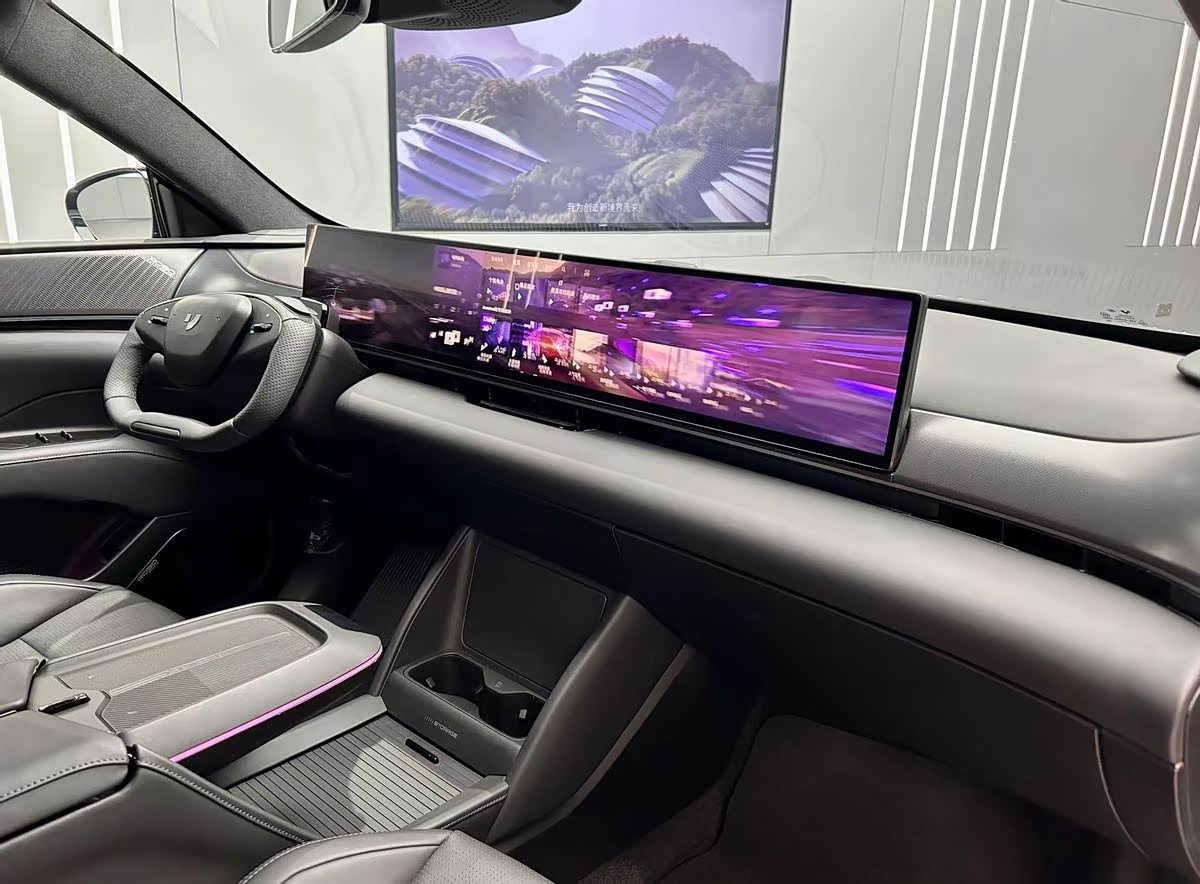 我们坐进车内来看下里面情况如何。中控35.6英寸的贯穿式大屏是一大亮点,尺寸很大是特斯拉Model Y的3倍,而且是6K超清一体屏体验感还不错。超大屏为新车提供很好的智能化载体,内置强大的高通8295智能旗舰芯片,性能比上一代提升了8倍,支持沉浸式3D交互,处于 领先水平。