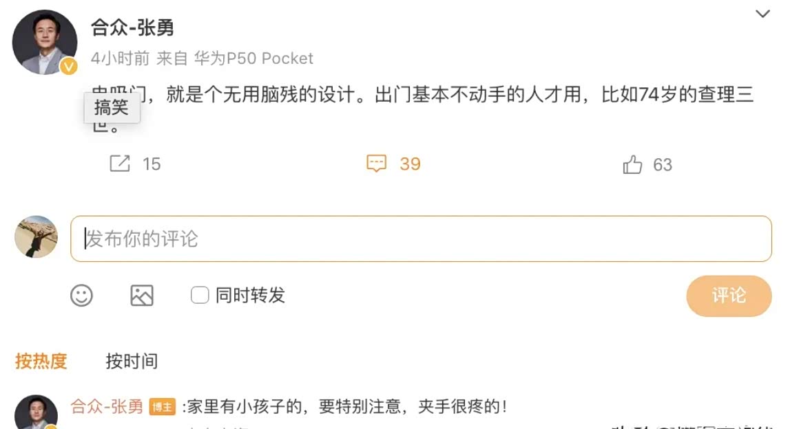 有意思的是,哪吒汽车CEO张勇也现身评论,他发文表示:“电吸门,就是个无用脑残的设计。出门基本不动手的人才用,比如74岁的查理三世。”同时,他还提醒大家,“家里有小孩子的,要特别注意,夹手很疼的!”