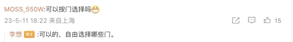 李想在评论区表示,(电吸门的开关功能)可以自由选择哪些门