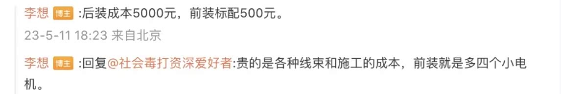 李想在评论区表示,(电吸门)后装成本5000元,前装标配500元
