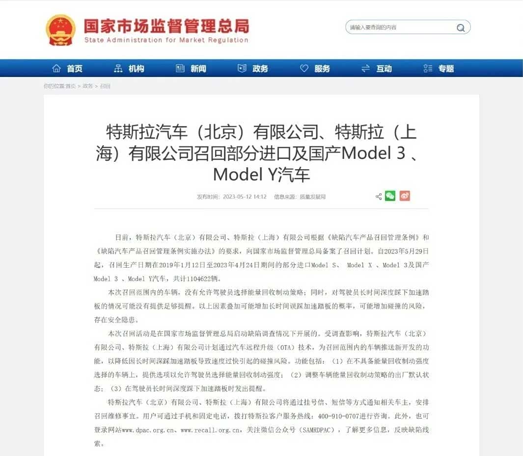 2023年5月12日,国家市场监督管理总局网站发布公告,由于没有允许驾驶员选择能量回收制动策略,同时对驾驶员长时间深度踩下加速踏板的情况可能没有提供足够提醒,特斯拉将在中国市场召回超110万辆进口和国产车型。