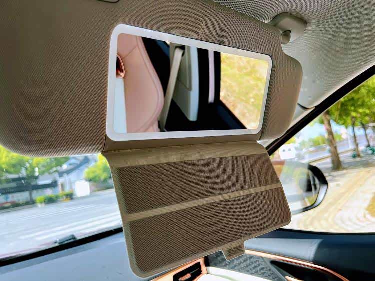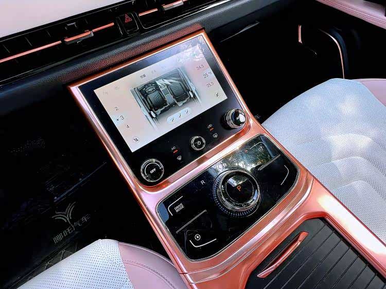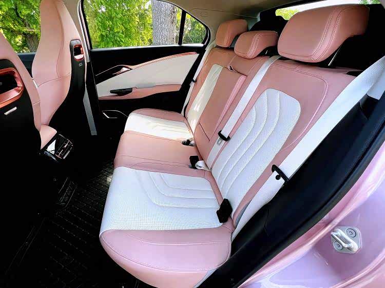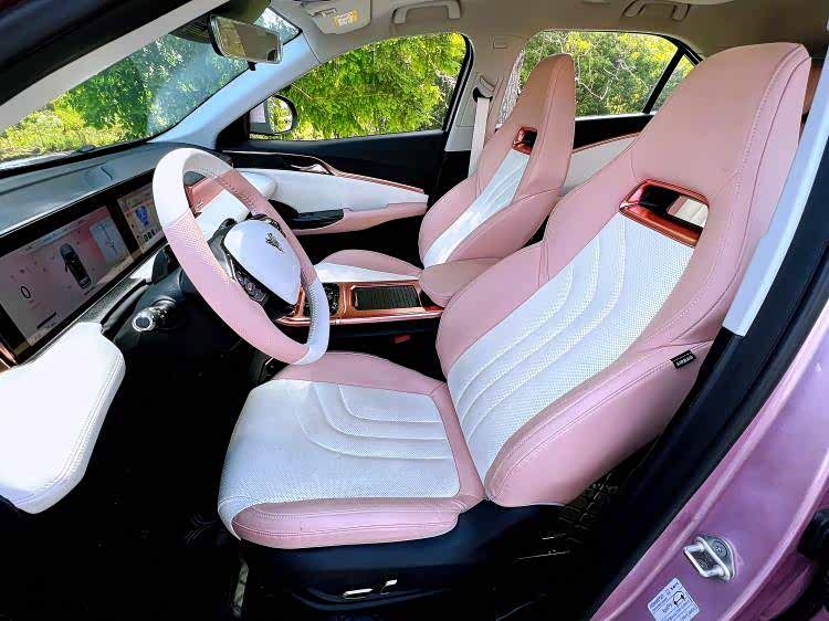 而内饰方面,哪吒U-II610注重细节和质感,采用高级皮革和铝合金材质,内置超大美妆镜(女性车主的最爱),以星空钻粉为主色调,给人一种独特的豪华感。宽敞的车内空间提供了舒适的乘坐体验,并且后排座椅可放倒,为携带大型物品提供了便利。另外,车内还配置了无极变色氛围灯,为用户带来沉浸式多彩多样化体验的第三空间。