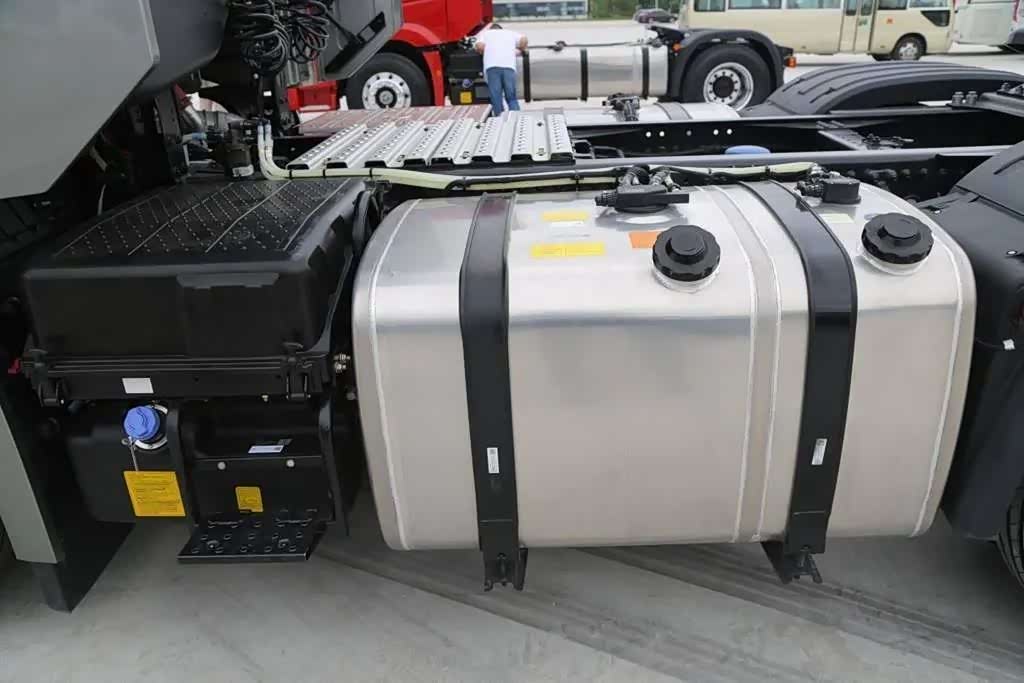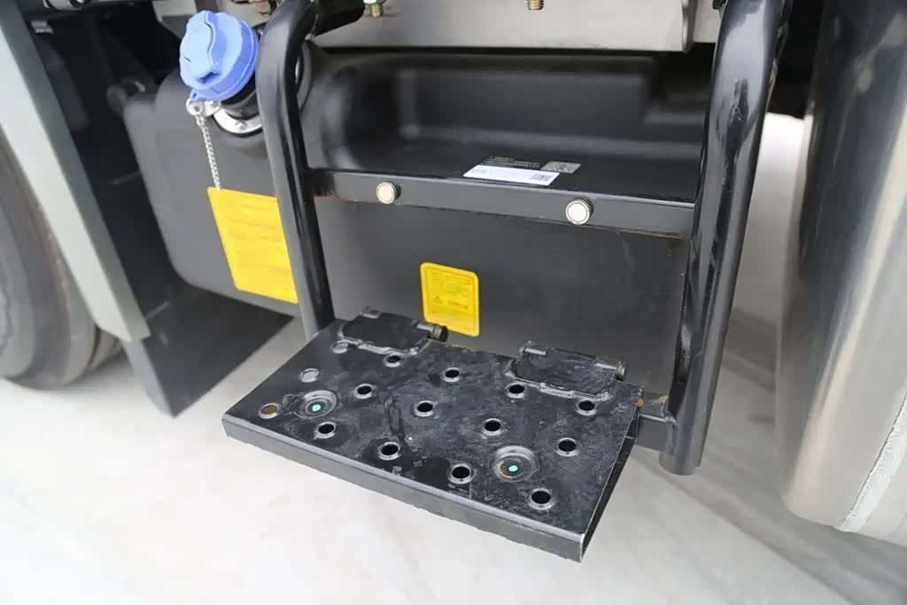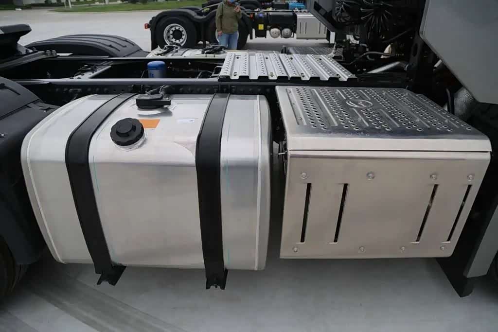 车架左侧的220Ah免维护蓄电池、尿素箱以及575L双腔大油箱。