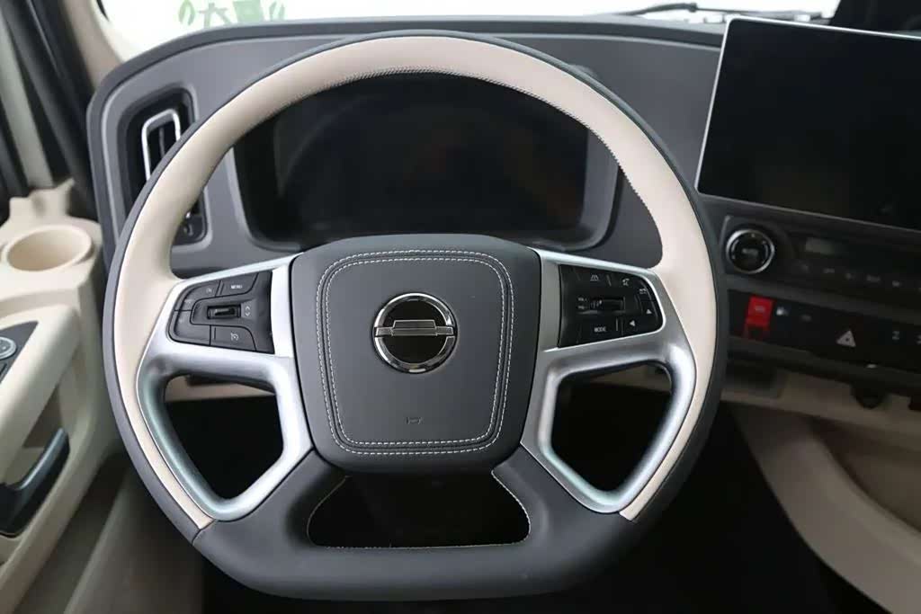多功能方向盘上还有着银色的装饰。运用在运动型汽车上的平底方向盘也被安装在北京重卡复兴上,驾驶员腿部活动空间更大,驾驶起来也更有运动感,更符合年轻一代驾驶员的喜好。
